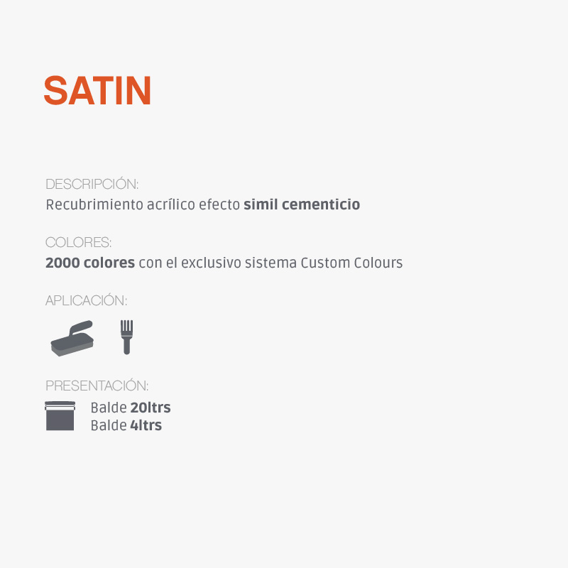 SATIN es un recubrimiento acrílico incoloro que permite ser entonado con el sistema Vadex Custom Colours y esta desarrollado para decorar texturas nuevas o darle nuevos efectos a texturas envejecidas. De uso interior o exterior, esta fabricado en base a una mezcla de resinas en dispersión acuosa.Beneficios