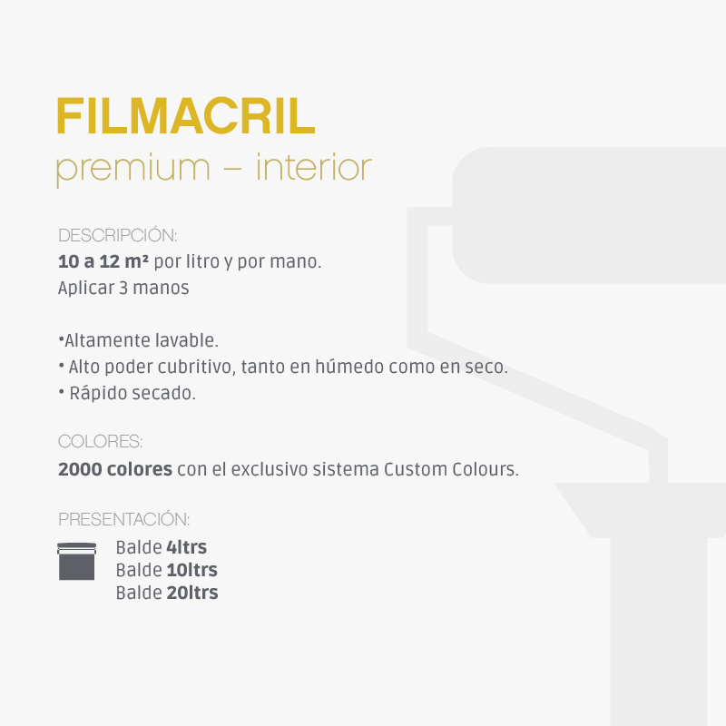 El rendimiento de FILMACRIL INTERIOR PREMIUM es de 10 a 12 metros cuadrados por litro y por mano, dependiendo del tipo de superficie a pintar.