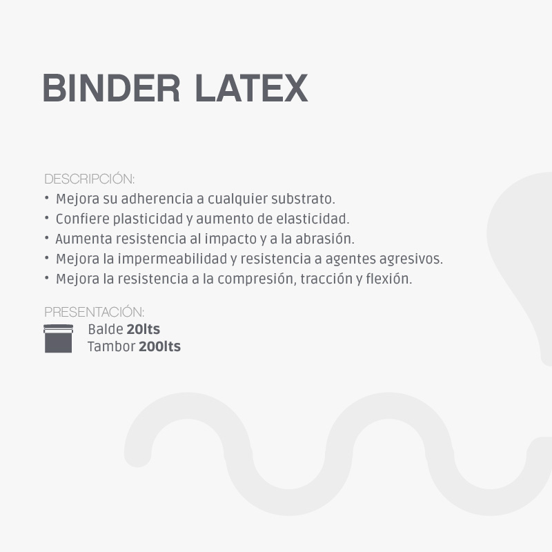 BINDER LATEX es una micro emulsión sintética a base de copolímeros acrílicos del látex, de color blanco, no inflamable ni corrosiva, de una densidad aproximada de 1.03 gr/cc, diseñada para añadirse a morteros u hormigones.Beneficios