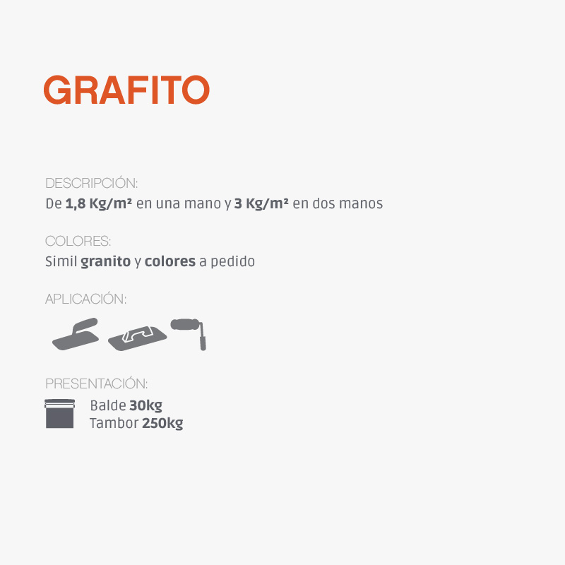 GRAFITO se aplica en una o dos manos sin color de base. Aplicar una primera mano extendiendo el material con una llana metálica perfectamente limpia a 30-45° respecto de la pared, luego alisar la aplicación con la misma llana metálica. Si se desea una superficie mas lisa, aplicar una segunda mano de GRAFITO utilizando la llana metálica extendiendo el material por toda la superficie de manera que quede una capa del espesor de la piedra contenida en el producto. Dejar tirar el material unos 5 o 10 minutos y luego alisar con fieltro de goma espuma para eliminar la rugosidad o los dibujos y que quede una superficie lisa. También puede aplicarse con rodillo o con soplete. - Con rodillo se debera extender el producto con llana metalica y cuando esté aun húmedo, pasar el rodillo para “levantar” el producto y dar la textura final deseada. - Pistola de Proyectar, diluyéndolo con 5 a 10 % de agua de buena calidad, utilizando un pico de 4 a 6 mm y una presión de 2 Kg./cm2, manteniendo la pistola perpen- dicular al soporte y a una distancia constante. Pulverizar con movimientos circulares hasta cubrir la superficie deseada. Recomedaciones: Antes de comenzar: enmascarar las superficies lindantes ya terminadas próximas al área de trabajo. Se recomienda realizar paños completos para evitar juntas o empalmes. En caso de paños grandes es aconsejable trabajar con 2 o mas personas para completar los mismos en una sola operación, evitando solapar con producto ya seco. De esta manera el film de revestimiento es totalmente uniforme y continuo, llevando al máximo sus cualidades impermeabilizantes. Se recomienda comenzar el trabajo con los paños mas pequeños para encontrar los tiempos de trabajo y la textura deseada, para luego hacer extensivo los mismos a paños mayores. - No aplicar si se preveen lluvias cercanas. - No aplicar con temperatura ambiente menor a 3° C o mayor a 35° C. - No aplicar con Humedad Relativa Ambiente (HRA) mayor al 80%. - Lavar las herramientas y las superficies contamina- das antes de que el producto se seque y utilizando agua y un detergente suave. Tiempo de Secado: Secado superficial: 4 a 6 horas ( al tacto ) Secado entre manos: mínimo 6 horas. Secado final: 5 a 7 días. Dependiendo de las condiciones ambientales. Durante ese lapso es recomendado cuidar al máximo la superficie para garantizar una mayor durabilidad.